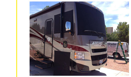 Our sunscreens are custom-made and professionally installed right at your RV site - we come to you! Our sunshades will provide your coach with over 90% UV protection, which will in turn protect the fabrics in your coach from fading and sun damage as well as a reduction in heat transferred through the windows. Our shades also provide daytime privacy. You can see out, but others can't see in. No more keeping your curtains closed all day!